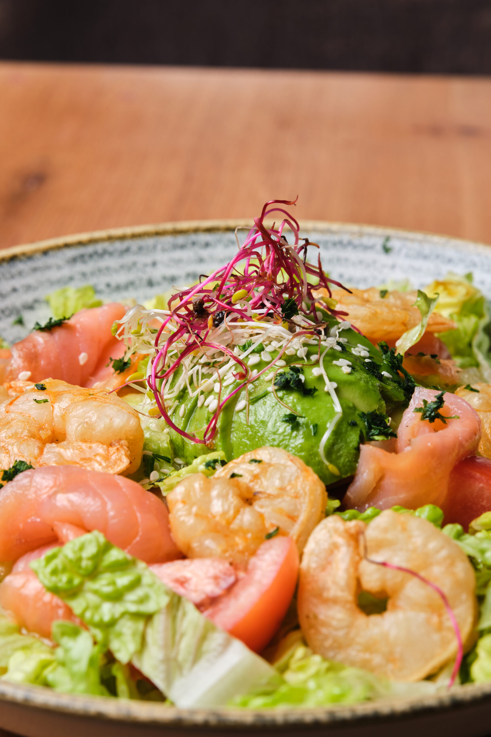 19€Carottes rappées, radis, ananas, concombres, avocat, vinaigrette aux agrumes - Au choix : Poulet crispy, crevettes ou veggy